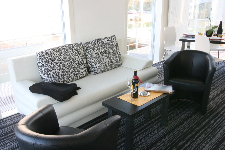 Das Wohndeck I ist das untere Deck des schwimmenden Hauses und hat eine Wohnflaeche von 52 m2. Dieses Deck verfuegt ueber einen Wohn- und Essbereich, eine Kueche, ein Schlafzimmer sowie ein Bad mit Dusche und WC. Ihnen steht der Hausumgang sowie eine moeblierte Terrasse von ca. 11 m2 zur persoenlichen Nutzung frei. Eine Belegung mit 2+2 Personen ist moeglich.